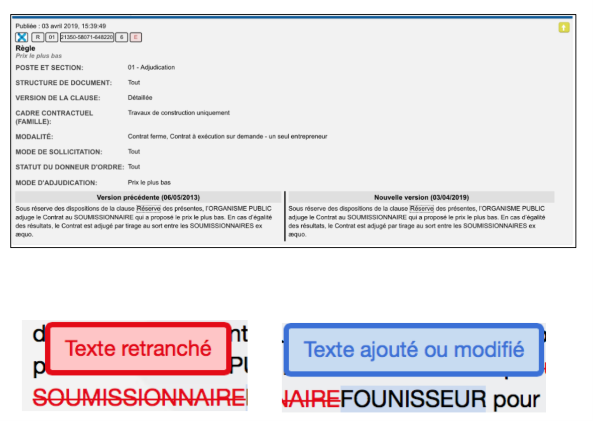 La nouvelle clause sera affichée avec son contenu. Si la clause a été mise à jour, la version précédente est affichée à gauche et la nouvelle version est affichée à droite ; Les modifications dans le texte sont affichées de la façon suivante :