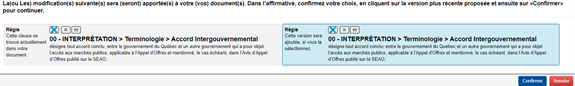 En cliquant sur ce bouton, une boîte de dialogue vous propose la version d'origine (à gauche) ou la version mise à jour de la clause (à droite). Vous devez choisir la version souhaitée en cliquant sur celle-ci, puis sélectionner le bouton « Confirmer ». Une boîte de dialogue vous demande ensuite de confirmer le changement. En cliquant sur « Confirmer », vous complétez l’opération.