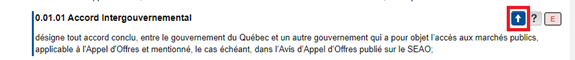 Afin de mettre la clause à jour, vous devez sélectionner la clause qui a été mise à jour, ajouté ou bien supprimé. Une bande bleue apparaît à la gauche de la clause, et le bouton de mise à jour, représenté par une icône bleu foncé avec une flèche vers le haut, apparaît à la droite de la clause.