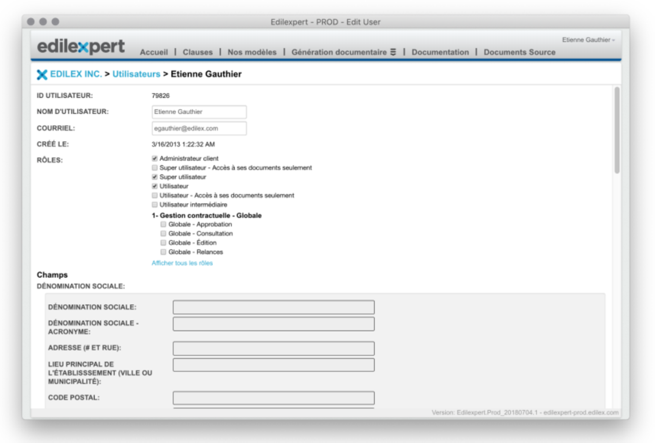 Cette section contient toutes les informations de votre organisation, qui peuvent être indiquées par l’administrateur client. Ces informations peuvent être modifiées par les utilisateurs lors de la génération d’un document aux étapes de « Renseignements et directives » et de « Révision ».